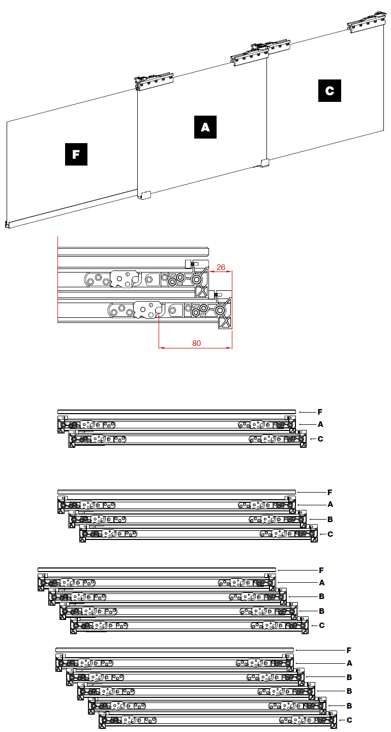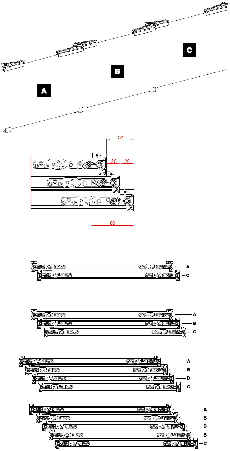 Система телескопического выдвижения стеклянных дверей. Данная модель позволяет выдвигать/задвигать в зависимости от комплектации от двух до пяти дверей с одной стороны проема, что позволяет экономить пространство с другой стороны проема.