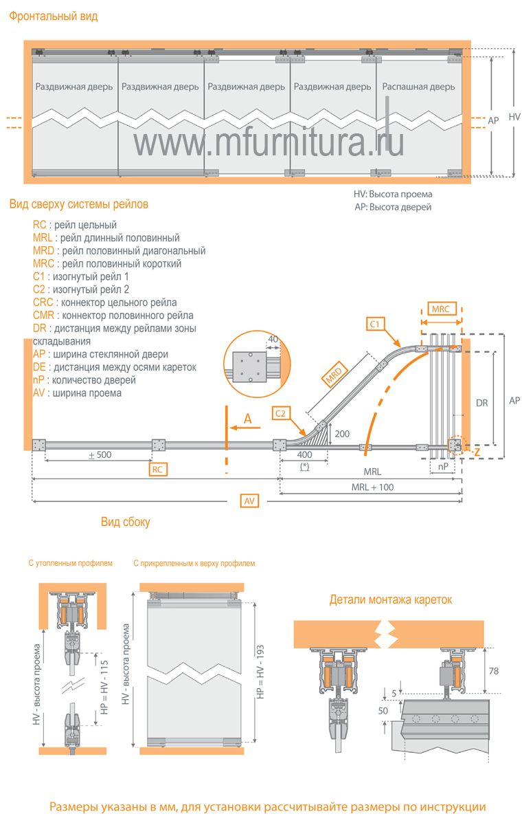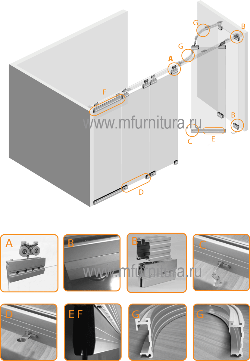Комплект изогнутых рейлов С1,С2. В комплекте два рейла с наружной и внутренней дорожкой под ролик. Крепится на потолок при помощи коннектора половинного рейла CМR. |