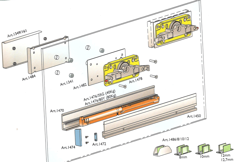 При подходе полотна к конечной точке роликовый механизм стопорится фиксатором или доводчиком, а само стеклянное полотно упирается в резиновый буфер арт. 266.