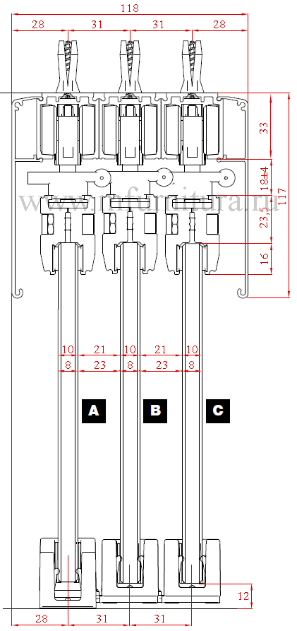 При подходе полотна к конечной точке роликовый механизм стопорится фиксатором или доводчиком, а само стеклянное полотно упирается в резиновый буфер арт. 266.